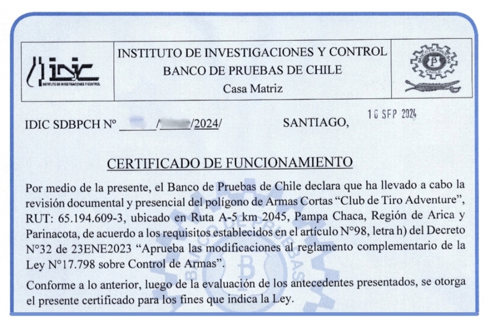 Nuestro Poligono de Tiro tiene autorización de funcionamiento de la D.G.M.N y de Carabineros de Chile, conforme al Reglamento Complementario Art. 98 H, de la Ley de Armas, siendo los únicos autorizados para
